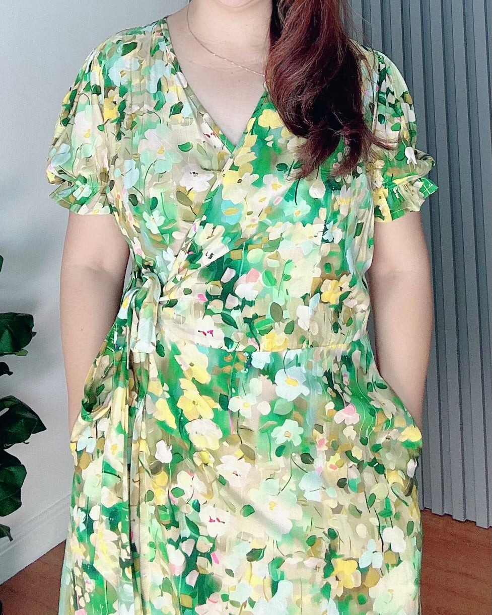 Our Say Dress, crafted from soft and breathable cotton challis fabric, features an overlap  style with a tiered detail near the hem, puffed sleeves with garter, and two pockets for everyday ease.