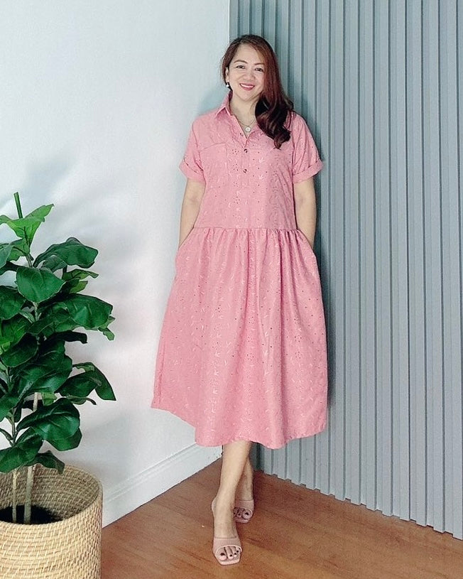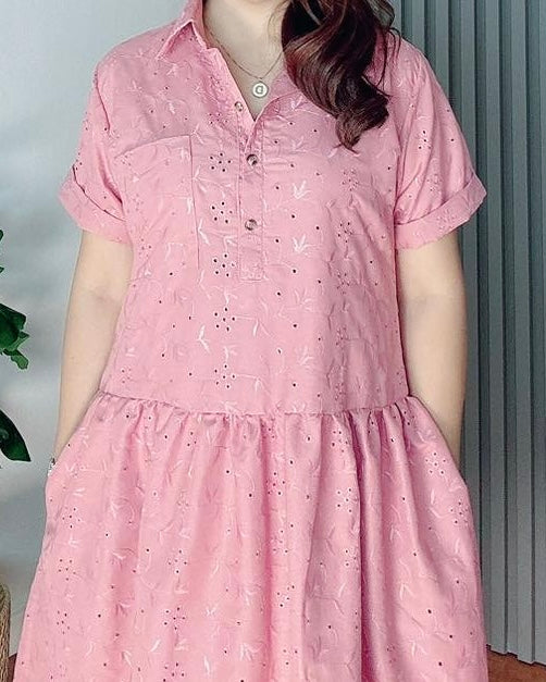 An easy, breathable dress made from soft cotton eyelet fabric for all-day comfort. This shirt dress features a collared neckline, half button front, and short cuffed sleeves for a clean, casual look.