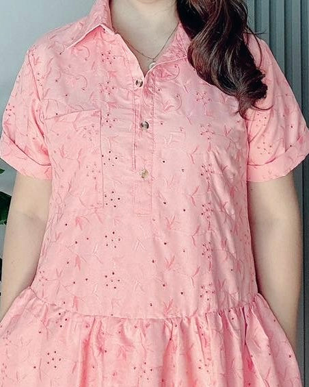 An easy, breathable dress made from soft cotton eyelet fabric for all-day comfort. This shirt dress features a collared neckline, half button front, and short cuffed sleeves for a clean, casual look.