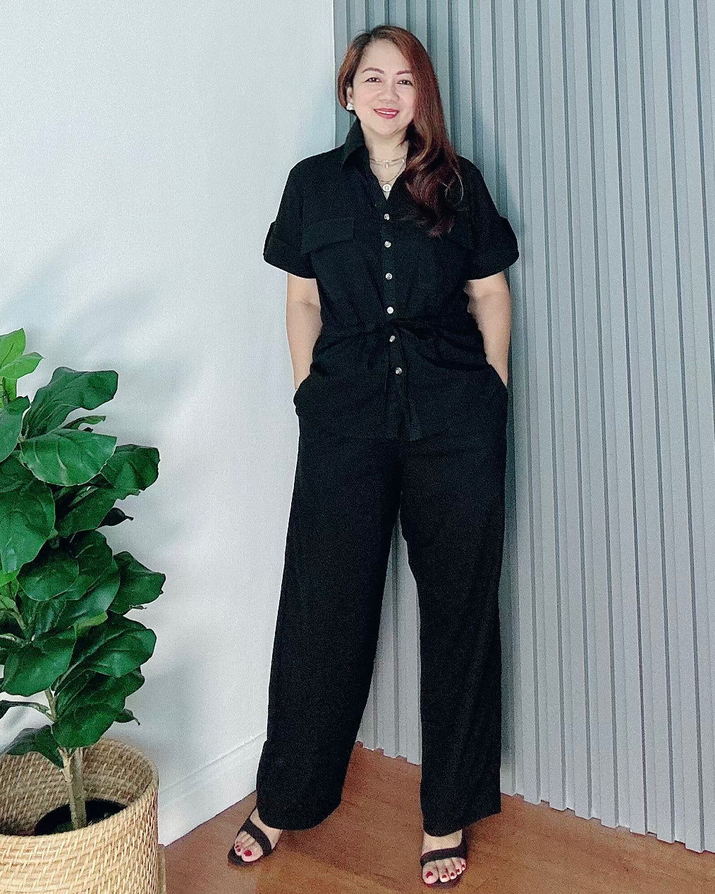 Effortless style meets comfort in this cotton-linen coordinates. The button-down top features sleeve tabs and drawstring waist for a flattering fit, while the wide-leg pants have a clean-front waistband with a back garter and two pockets- perfect for everyday wear from work to casual days out.