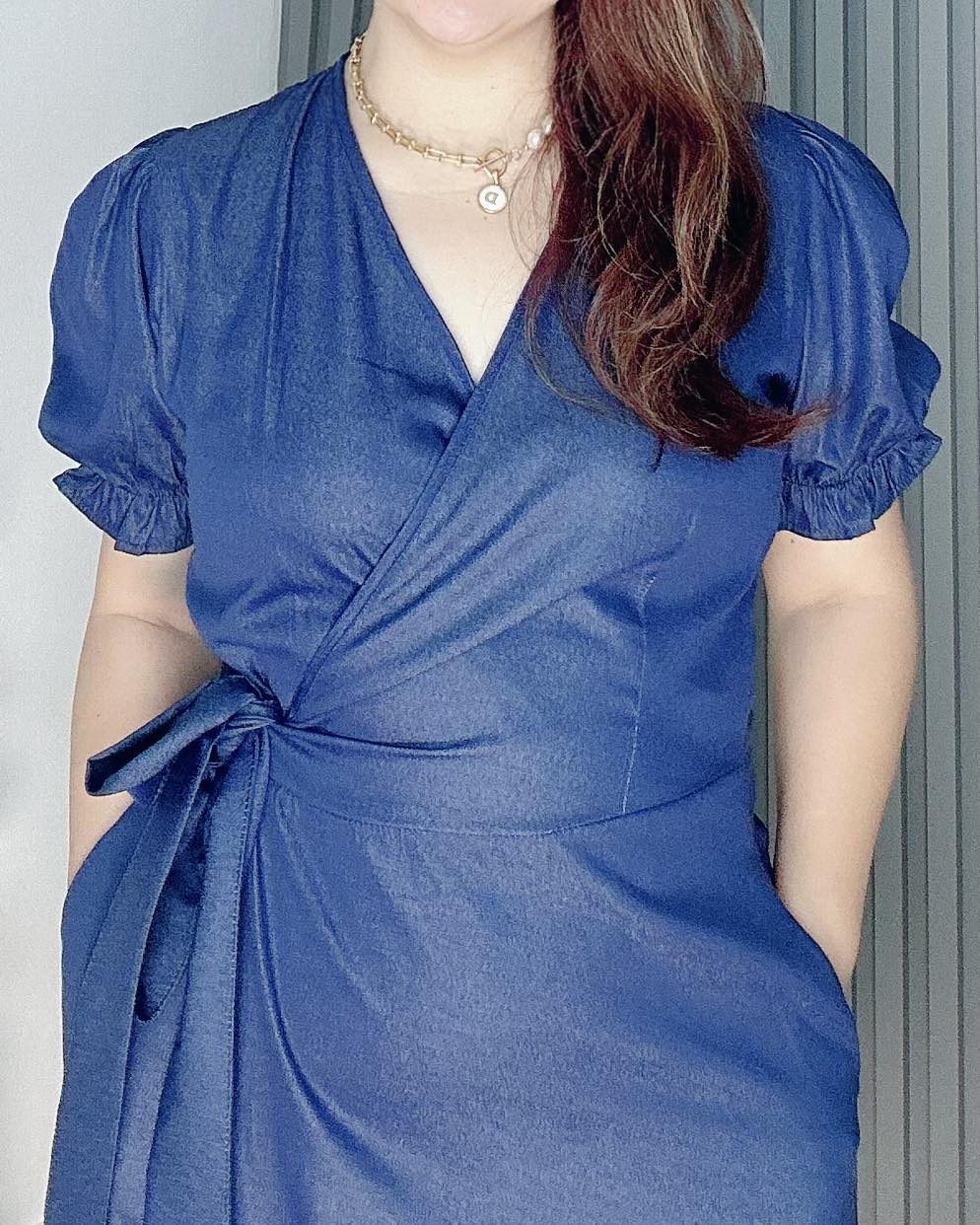 Our Say Dress, crafted from soft and breathable cotton denim fabric, features an overlap style with a tiered detail near the hem, puffed sleeves with garter , and two pockets for everyday ease.