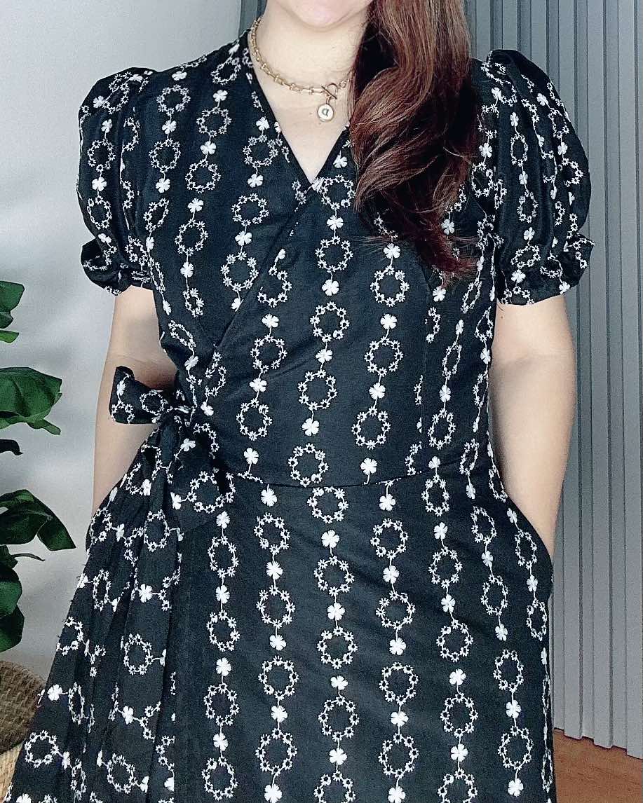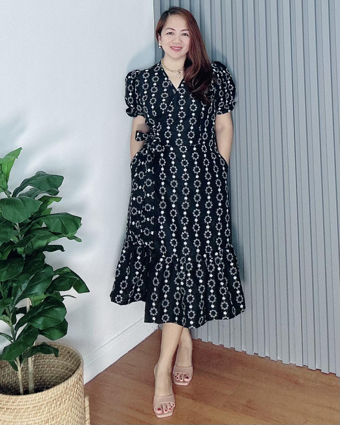Our Say Dress, crafted from soft and breathable cotton eyelet fabric, features an overlap style with a tiered detail near the hem, puffed sleeves with garter, and two pockets for everyday ease.