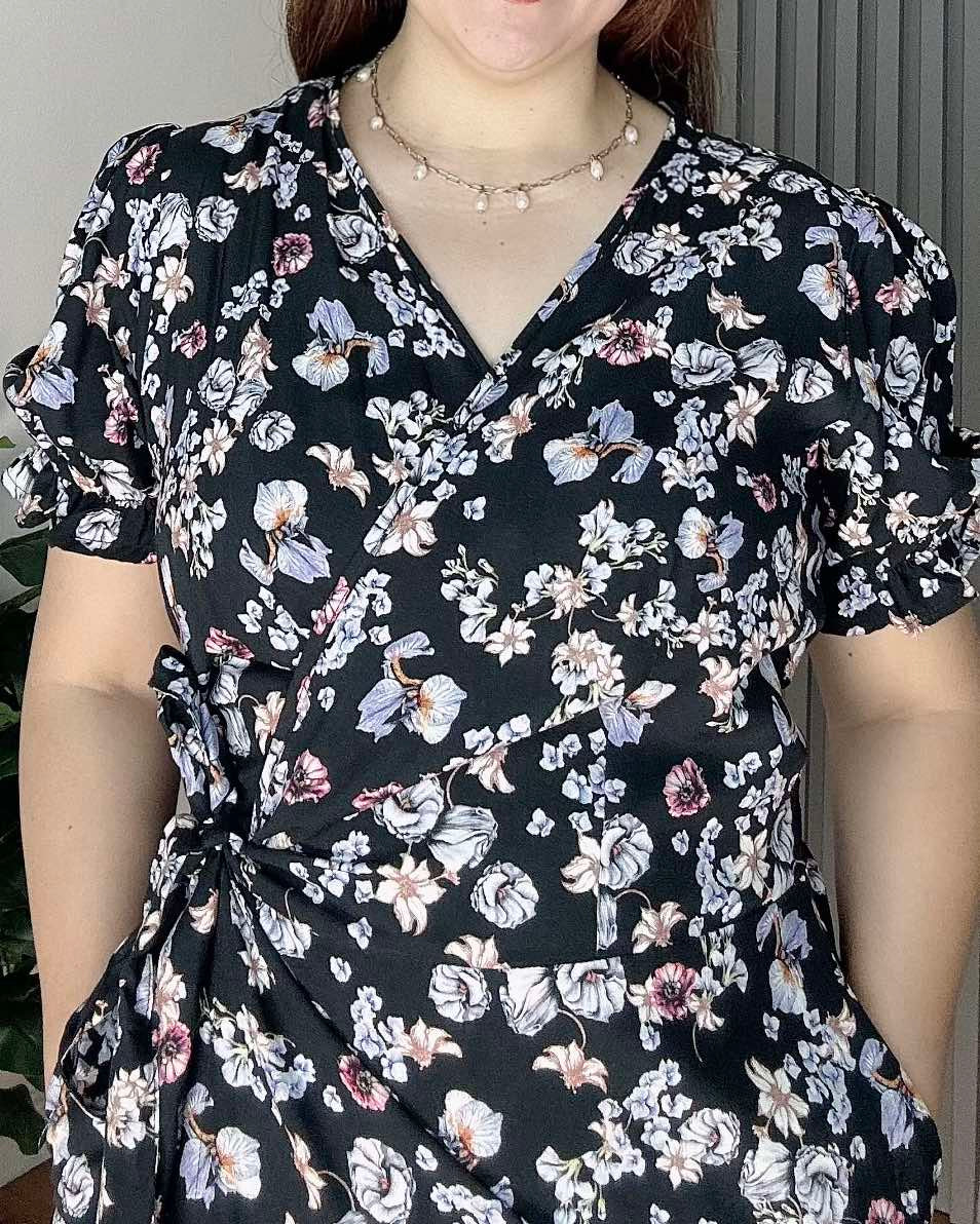 Our Say Dress, crafted from soft and breathable cotton challis fabric, features an overlap  style with a tiered detail near the hem, puffed sleeves with garter, and two pockets for everyday ease.