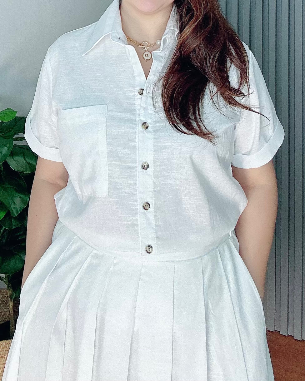 Trisha Coordinates features a collared button-down top with short sleeves, paired with a skirt designed with a flat front, garterized back, belt loops and two pockets. Finished with elegant pleats for a refined look.